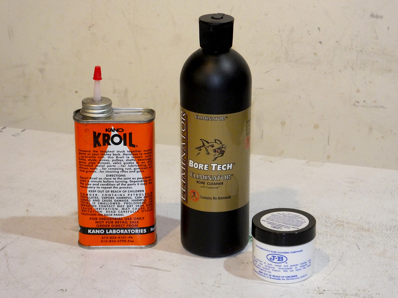 So here are the three things I run through my bore on cloth patches. The first item is Kroil that is an oil I like that will penetrate, help lift carbon and other debris in the bore. Second, Bore Tech Eliminator is an awesome chemical process that breaks down the copper. You can leave it in the barrel and it won't harm your barrel like an ammonia-based Barnes CR2 cleaner would. The third is JB Bore Paste, which is my new addition to my cleaning process. JB Bore paste that is a mechanical process that scrubs and polishes the bore.