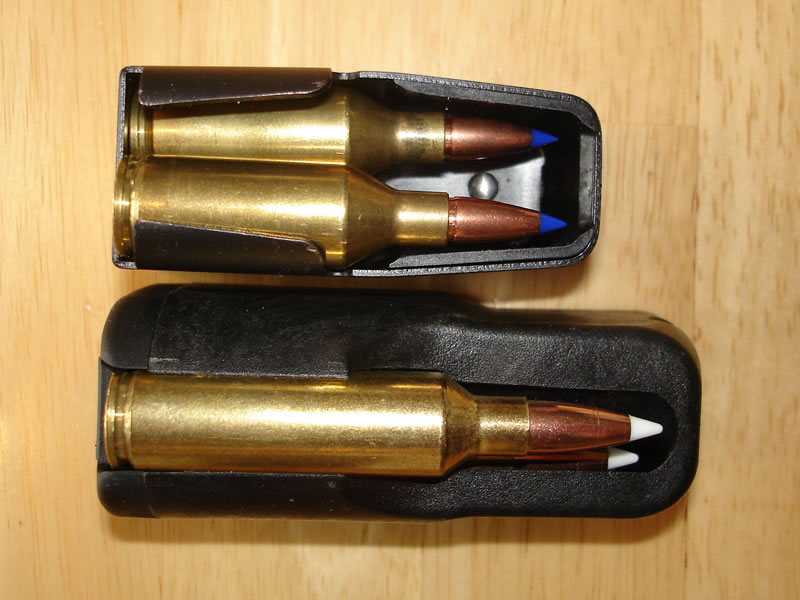 A-Bolt leaf spring magazine with alternating 243 WSSM cartridges. (top)X-Bolt magazine with rotary magazine and 270 WSM cartridges.