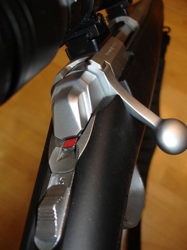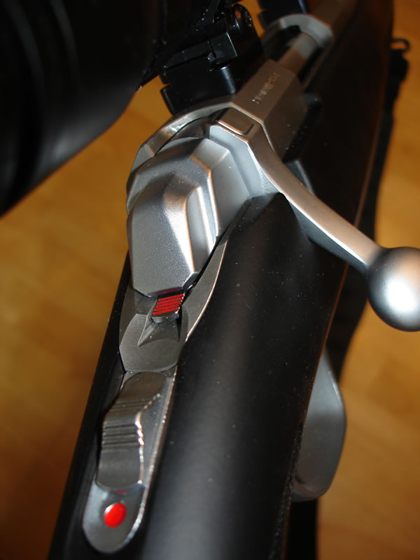 X-Bolt safety in safe position showing the bolt unlock button (at the top of the bolt handle) in the up position.