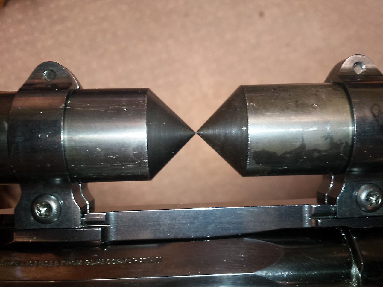 One of the challenges with the Model 1885 is mounting scopes. The rifle is drilled and tapped on the flat area of the barrel right about four inches in front of the receiver. It is also drilled and tapped on top of the rounded receiver. As I have learned the taper on the barrel isn't exactly the same from one rifle to the next. Basically, to get the octagon barrel it is just ground out until it "looks right" is how it has been described to me. I'm sure that it is a little more sophisticated than this but in the end, no two tapers are exactly the same so with a base mounted on the taper of the barrel it presents a problem in getting the rings to align.
