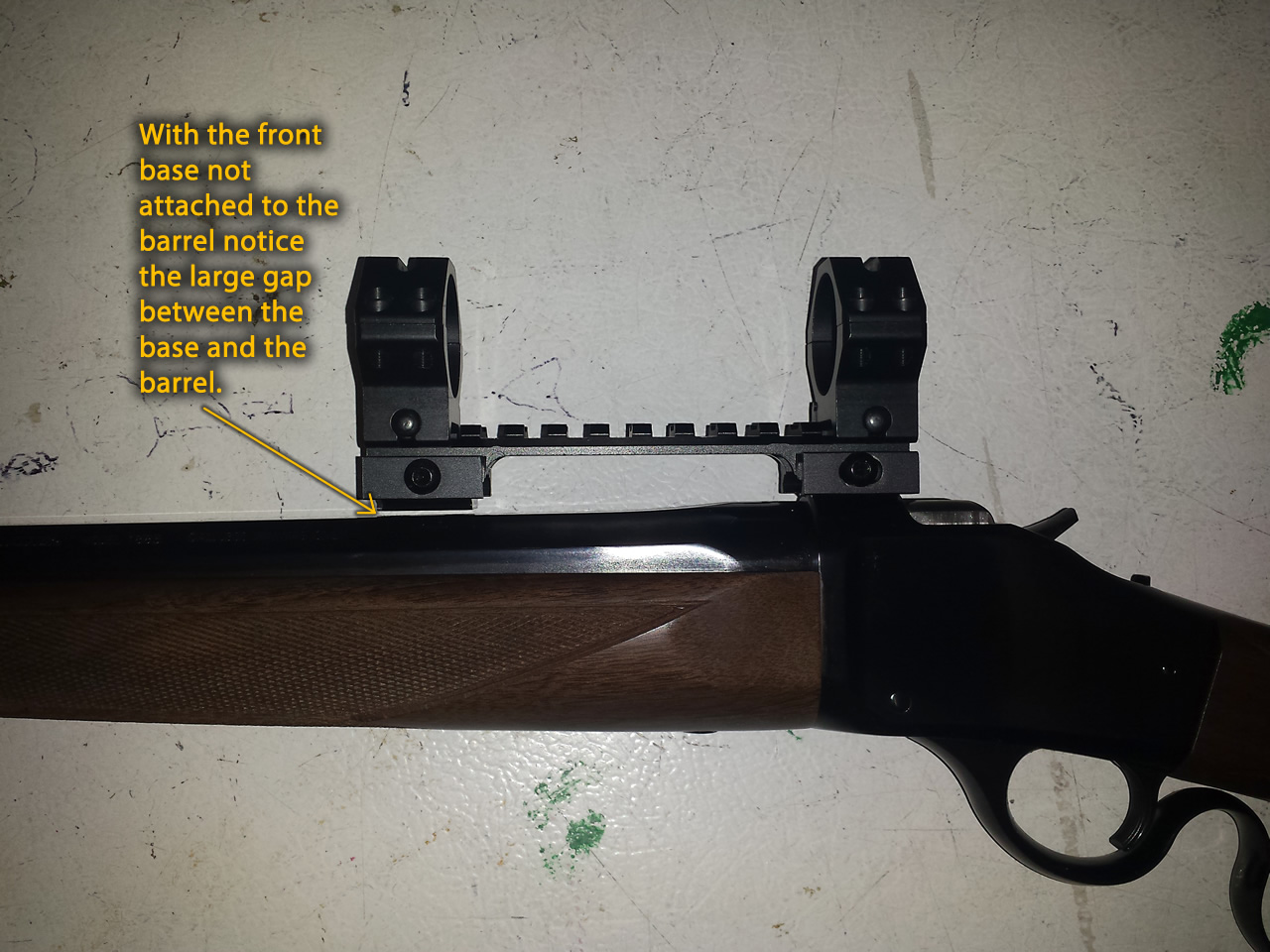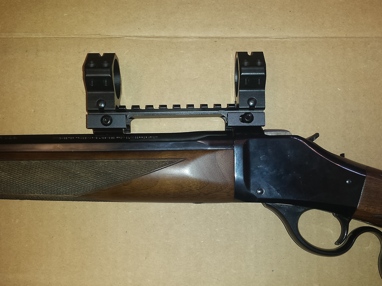 I tried to get a picatinny rail on the Model 1885. The problem I ran into is that, with the Weaver bases, there was a 42 MOA drop from the rear base to the front base. In this photo I only screwed down the rear Weaver base and then just clamped the front Weaver base into the riser rail to show the height difference from the front to rear on this Model 1885.