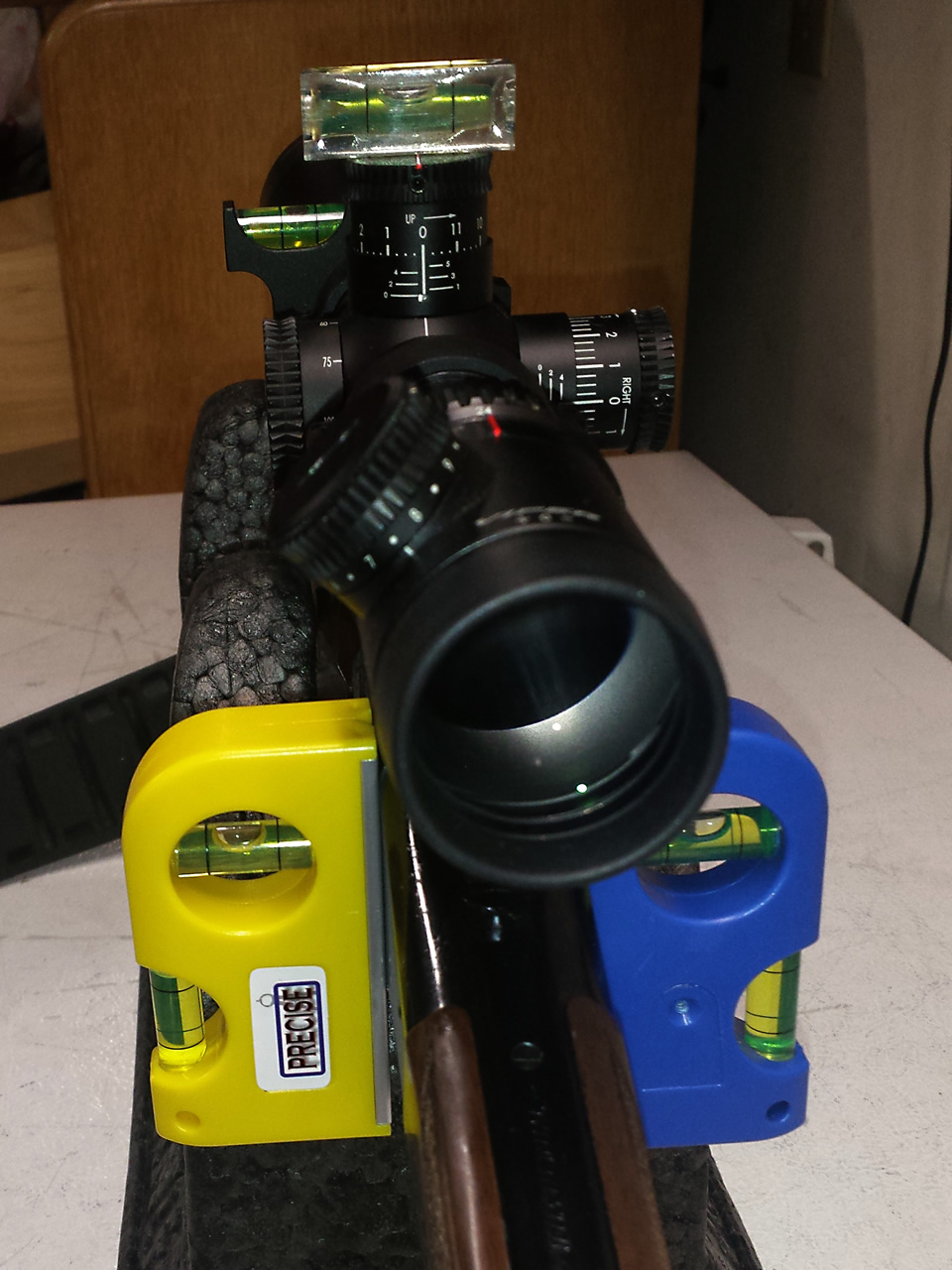 To get everything aligned I use a couple of magnetic levels with perpendicular levels and snap them to the side of the receiver. I then place a picture hanging level on top of the scope cap. Once I have it all level I tighten up the rings and lock the Vortex level in place.