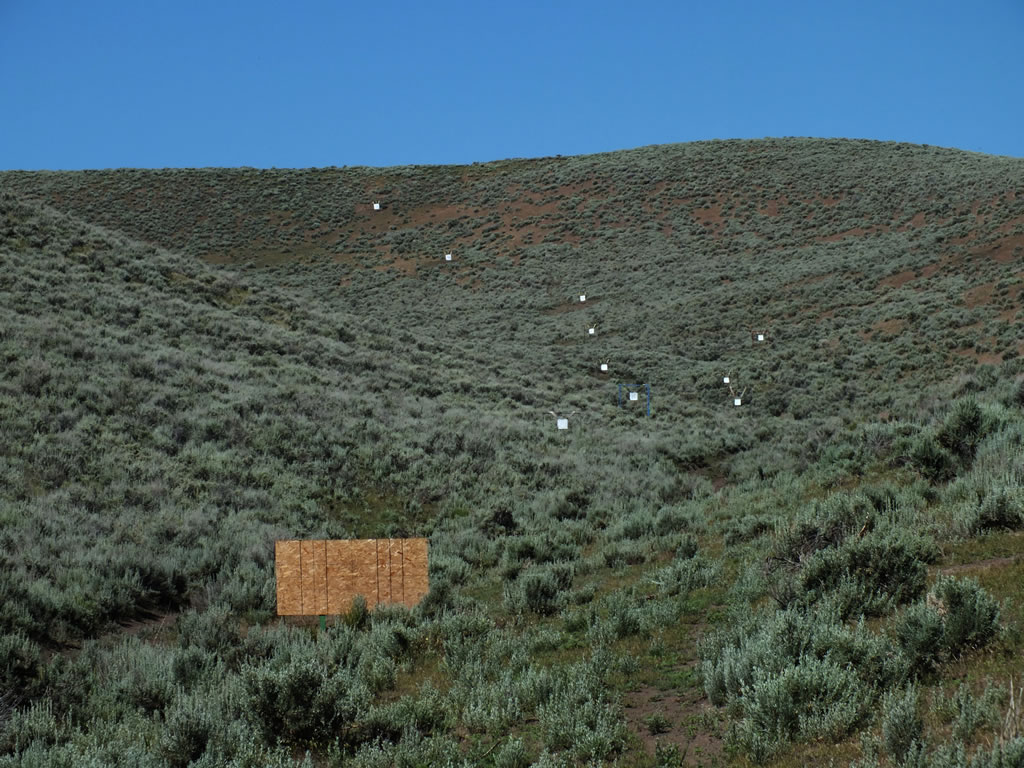 Targets in 100 yard increments from 300 out to 1200 yards at Spirit Ridge Rifle Golf Driving Range. The steel plates get a little larger with the next further plate.