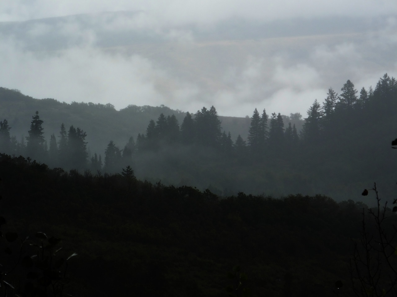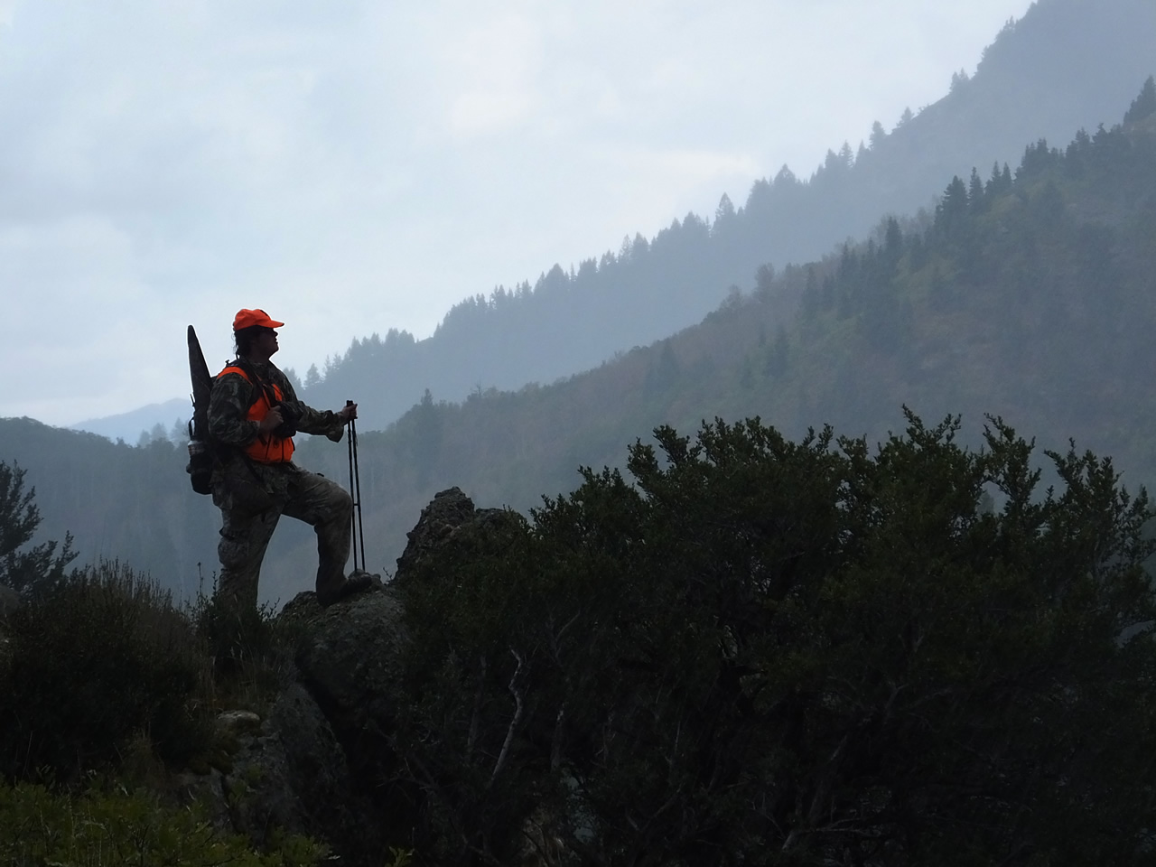 Before light opening morning we set out hiking in the rain to one of my favorite places to watch from. Once we got there we setup a military poncho as a rain fly over top of us. As the fog and storm cleared we didn't see any elk at this location.
