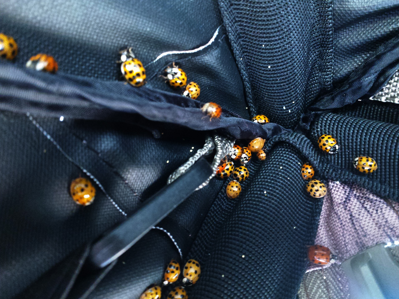 A lady bug invasion inside of the ground blind.