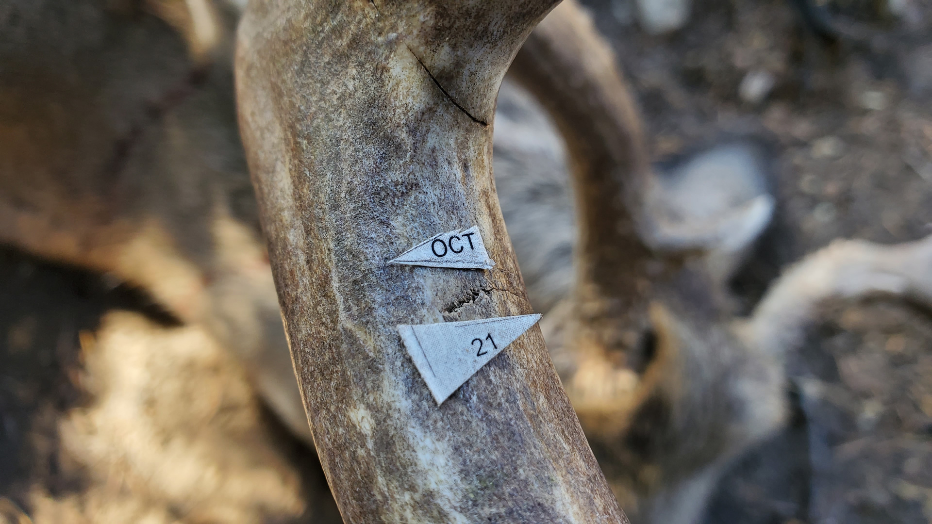 After getting to the buck we found that its left antler had nearly been shot off a few days prior. We made a splint on the antler to make sure we didn't break it completely off while we were working on it. As we were taking photos of his notched tag on the antlers we kept noticing some odd cut marks on the right antler. It took us a while to figure this out but the cut marks line up perfectly with two blades of a three-bladed broadhead. How crazy is that? He was shot in the right antler with an arrow and the left antler with a rifle.