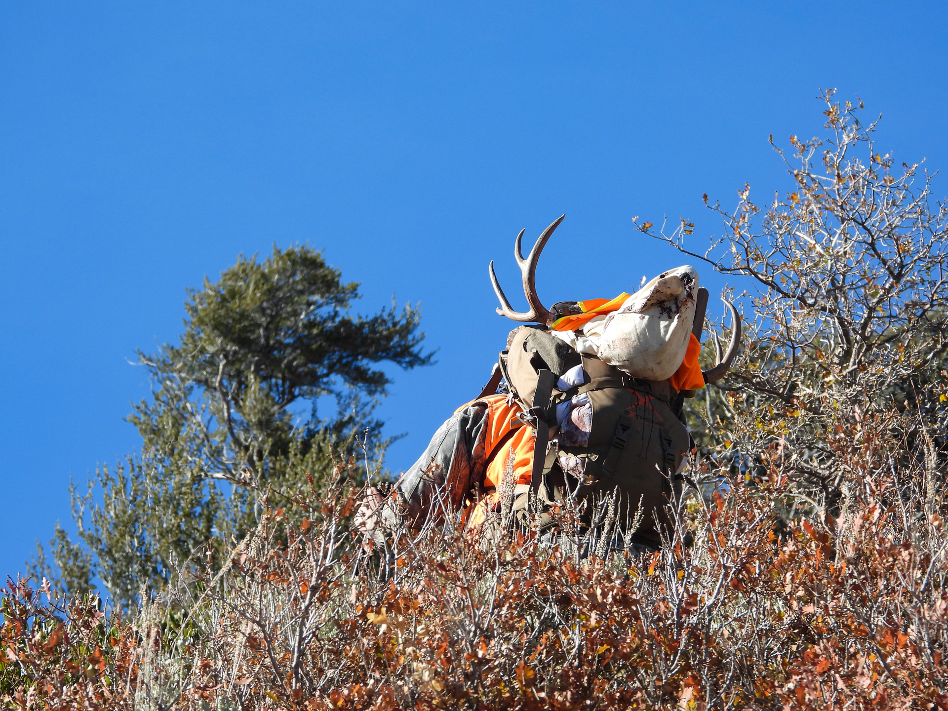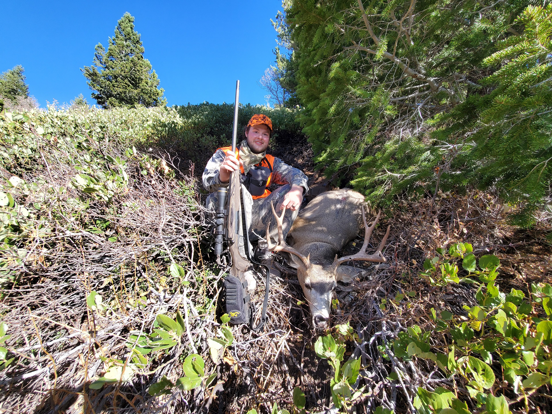 On the first trip out on the Wasatch Dallen found a good buck way down the mountain. We hiked down and around to get to the buck as fast as we possibly could. As we closed the distance from 1,200 yards down to 454 yards we watched the buck bed under the edge of a pine tree. The buck was bedded offering a decent shot if Dallen could thread it into his chest. Setting up with some shooting sticks and a pack under his shoulder Dallen made a near-perfect shot with his X-Bolt in 300 WSM and the buck never moved.
