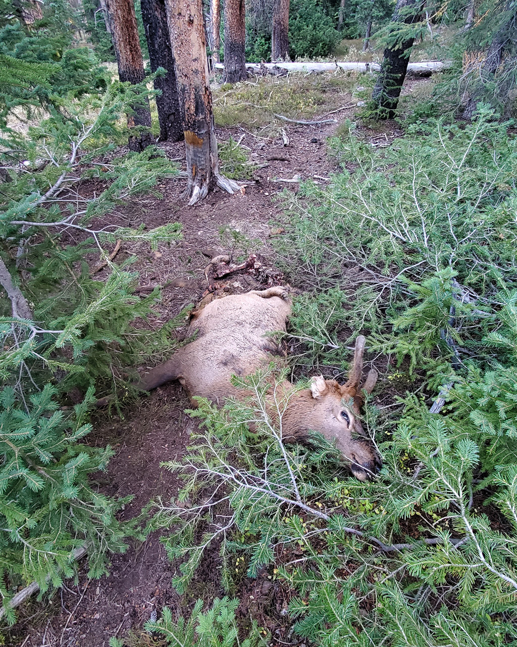One day hunting my way slowly back to camp I found a spike elk that had been shot in the hindquarters with an arrow from what looked to be about a week prior.