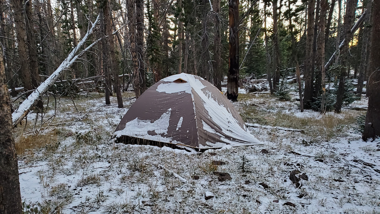 Waking up to snow while archery elk hunting in Uinta mountains.
