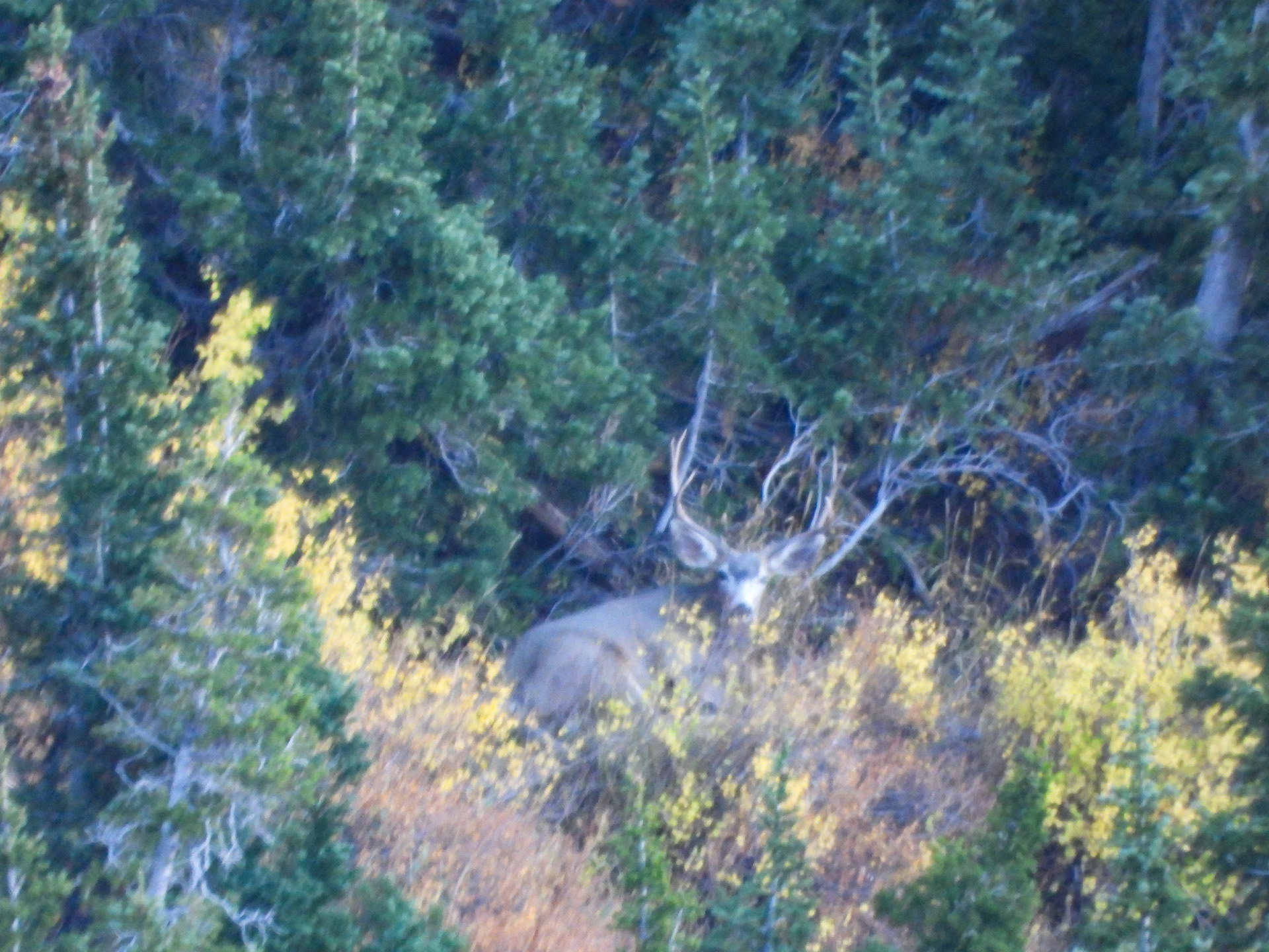 Monday morning we woke up early around five o clock and took off. The first day a few minutes into our arrival we spotted a few bucks four hundred yards away. The biggest buck was a small three-point that I didn't mind trying to get a shot at with the Muzzleloader. So we kept an eye on the three-point and the other smaller bucks, they went lower and lower. So we made a plan to go lower and cut them off essentially. We chose a spot under three hundred yards away from them. We lost sight of the deer in a larger group of trees, and that's when we slowly made our way around to the area where they were located. However, when we went up to move a little closer we bumped the deer. They took off and we couldn't see them through the trees, the three point stopped in the open for a split second but we didn't have time to range them. It is amazing how fast deer and even elk can run, they can travel a thousand yards in just a minute.