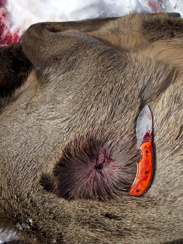With one half of the elk boned out we flip her over and find the 243 WSSM 80g Barnes Tipped Triple Shock exit hole. Pictured also is my favorite knife — a custom Russ Kommer knife designed for my Do-It-Yourself hunting needs. |