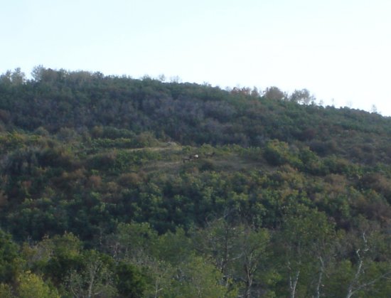 Early the next morning there was no sign of them in the canyon they were in the night before so I decided to work my way around into the next canyon, cow calling as I went along. I crested one finger ridge and cow called and the canyon erupted with crashing timber and hoofs blazing out of the canyon. I guess I was a little to aggressive with the cow call, because four young bulls and a couple cows headed for the next canyon when I blew the cow call. I did get one of the bulls to come back to investigate to about 100 yards then he decided he didn't like something and he left.