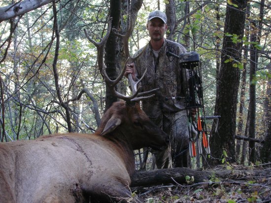 My first shot the night before had entered nice and low behind the heart but when he whirled the arrow bent back and though the intestines then out and back into his hind leg stopping against his femur. At times elk can be very tough animals to bring down.