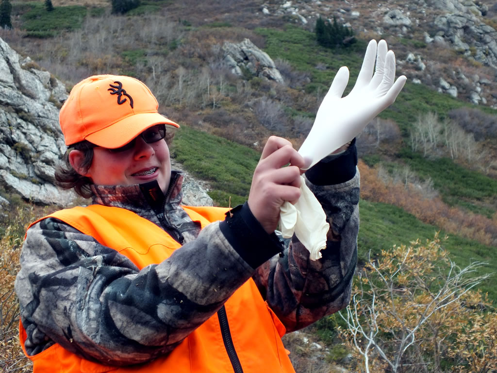 Dallen putting on the latex gloves to help his old man with boning out the mule deer.