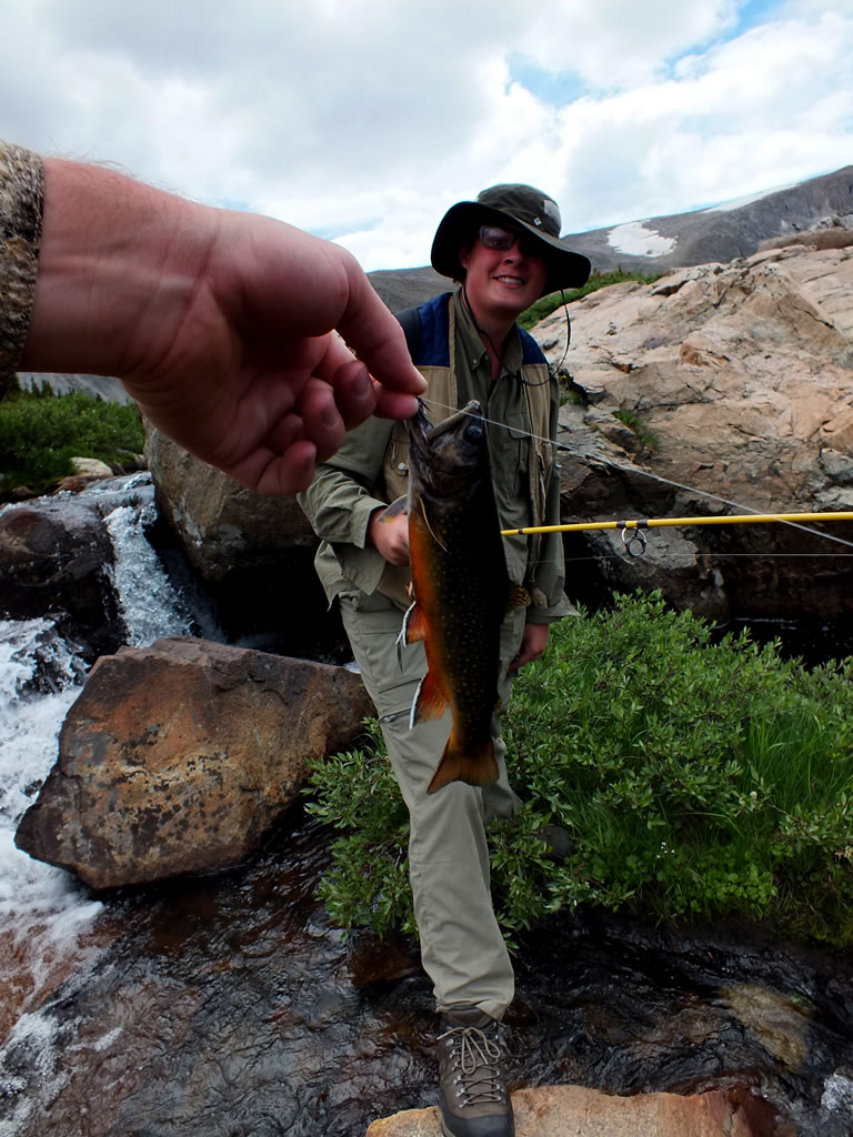 A beautiful dark colored Brook trout Dallen caught on a fly in a stream between lakes in the Stough Creek Basin.