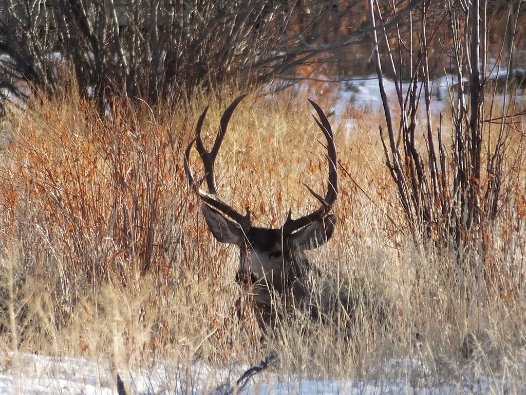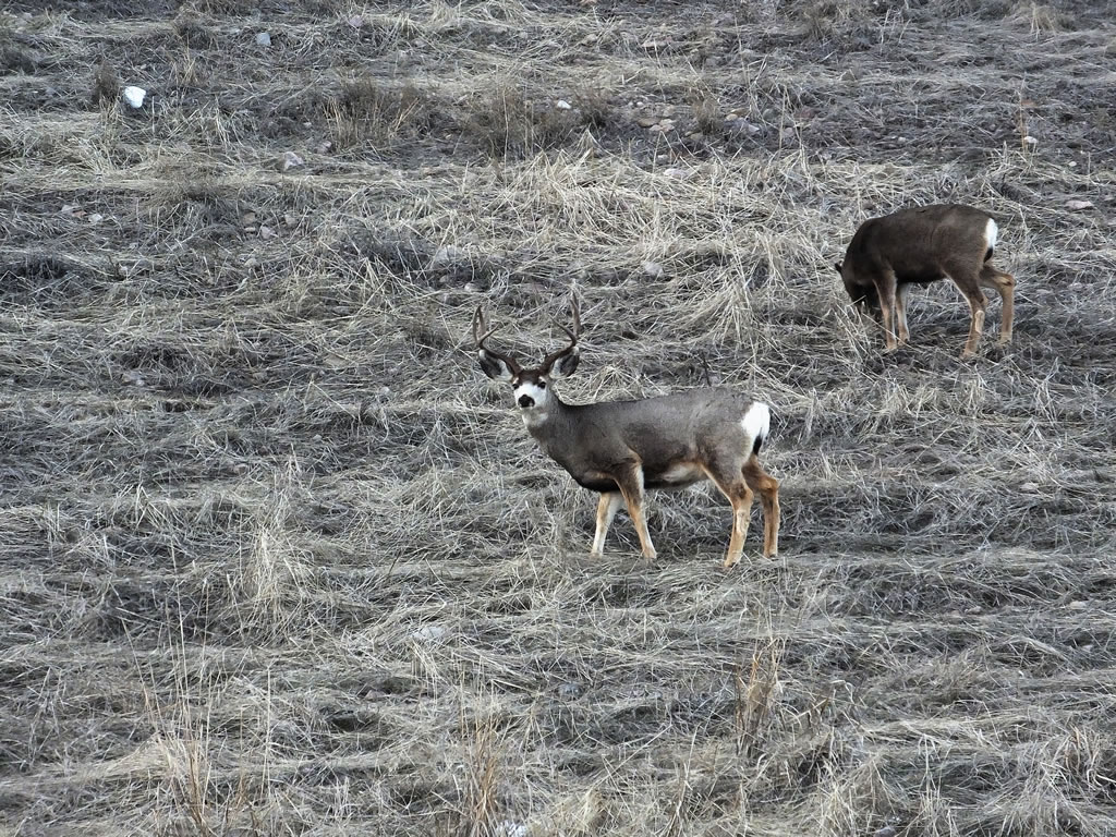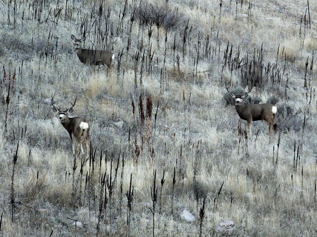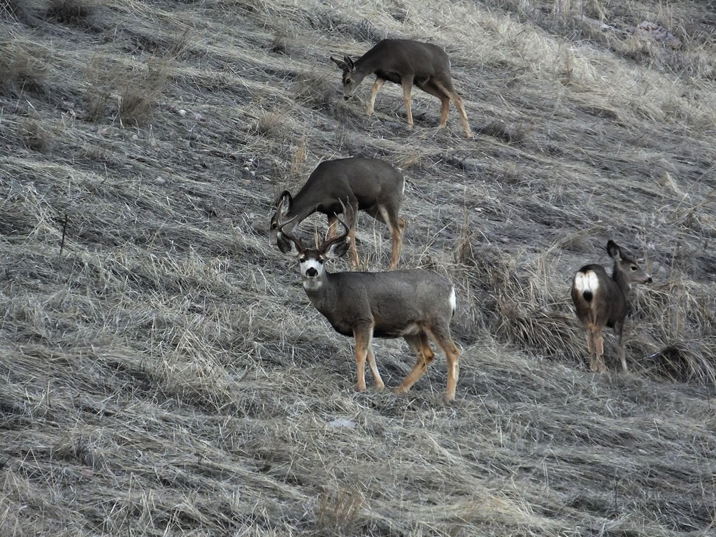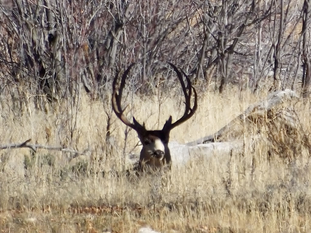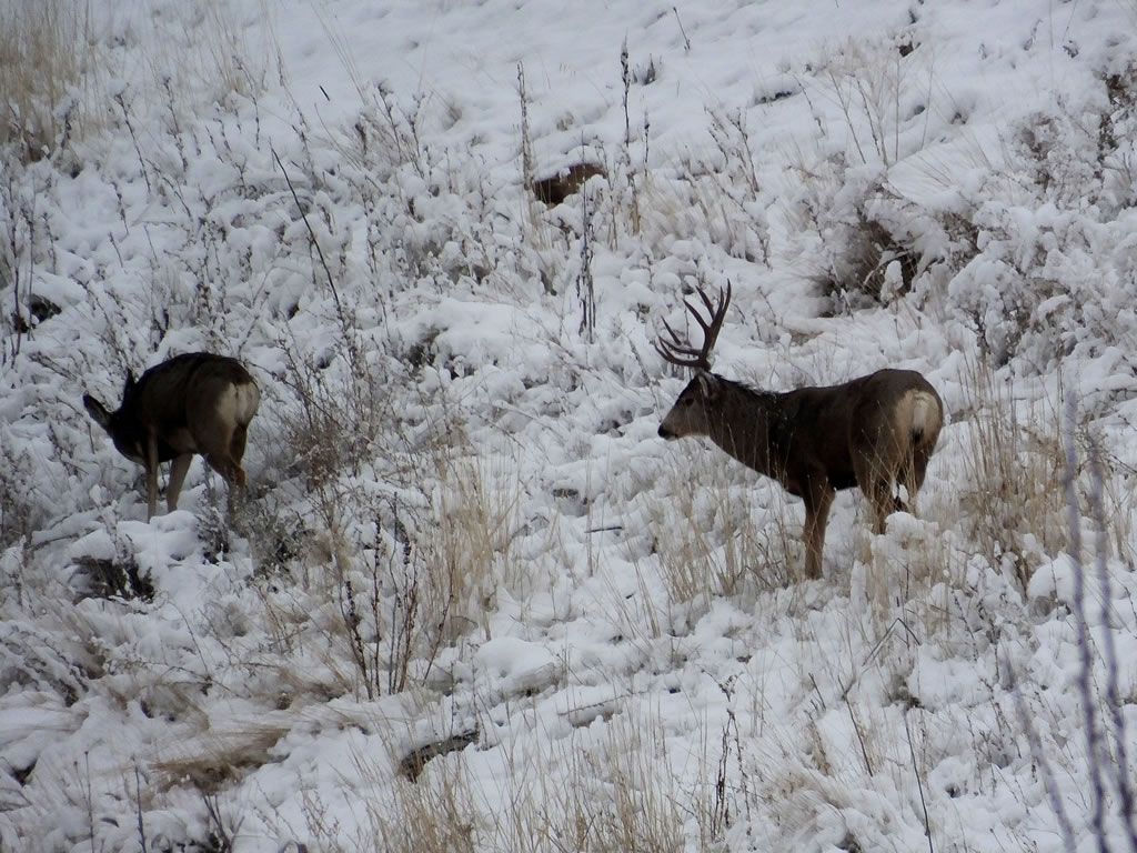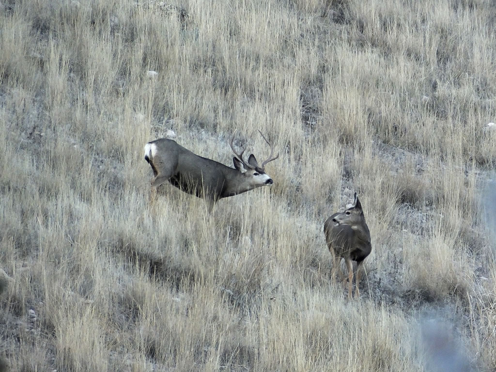 Here are some photos of mule deer and other critters I have recently taken with my new FujiFilm HS50exr digital camera. I'll add photos as I get them this winter. Most of the photos are taken at long distances with the zoom set at 42x (1000mm). All of the photos are with the camera handheld. Being a new camera for me I am learning that it behaves a little different than my old HS20exr. First, I have found that you need to make sure the focus mode switch on the left side of the camera is set to "S" for Single. Having it in Continuous "C" mode makes for getting pictures of deer that are in focus pretty darn hard. I learned the hard way with that mode... I have also found that I like the plain Auto mode over the EXR mode for getting better in-focus images. I have also stopped shooting raw photos and gone straight to just JPG. Yes, raw is better but I find it better to get a JPG than to get nothing. Shooting in raw slows down the speed with which the camera can recover before shooting another photo. I get a lot more photos of the action when shooting only JPG.