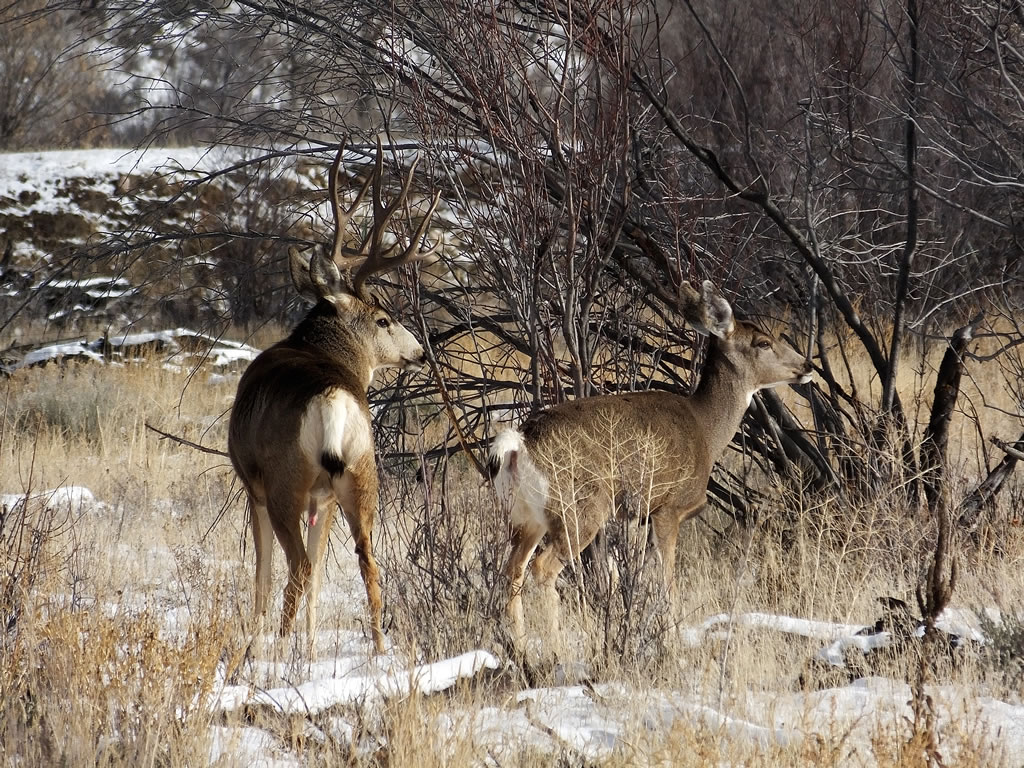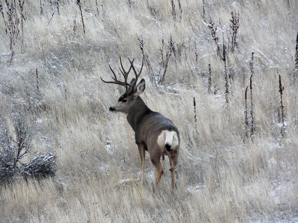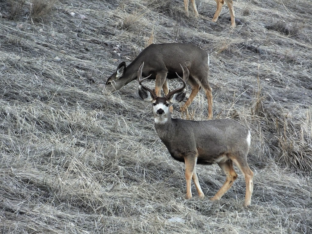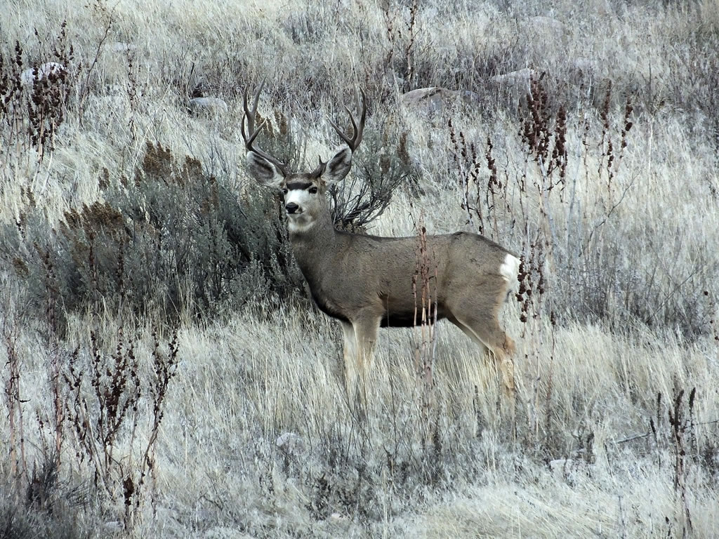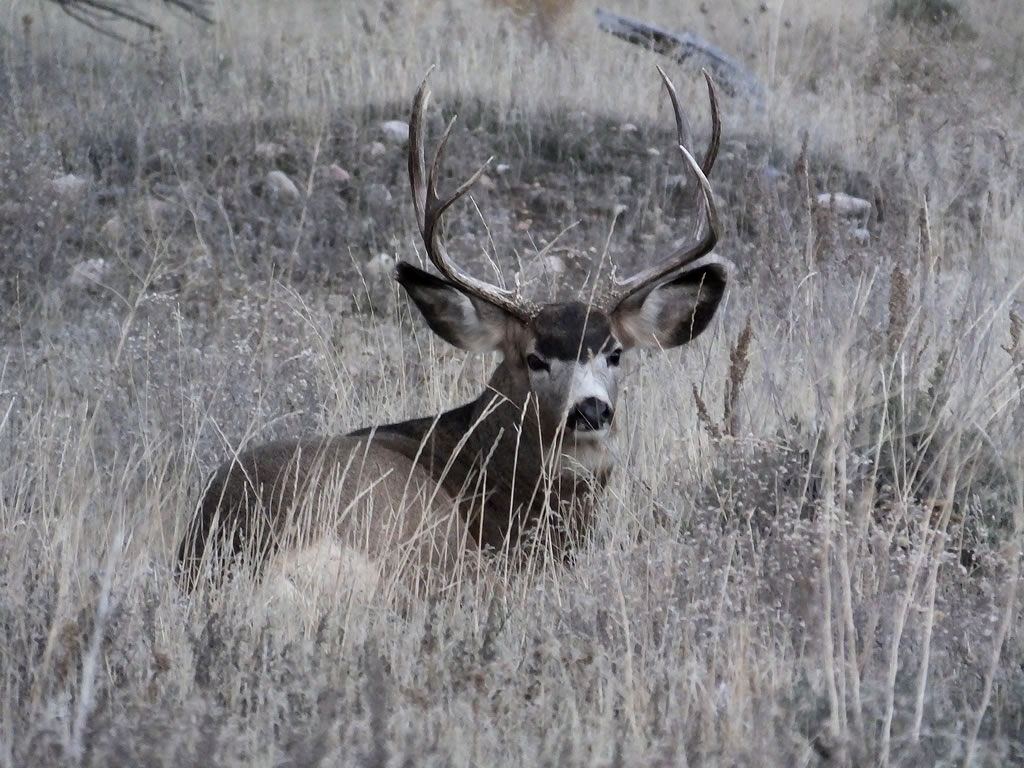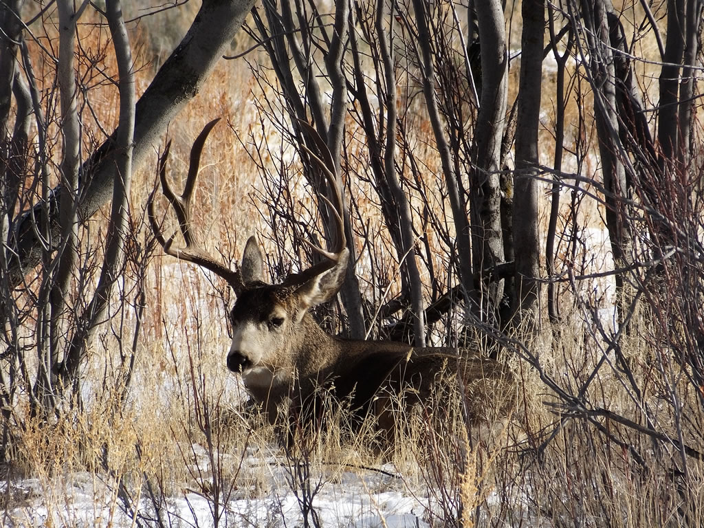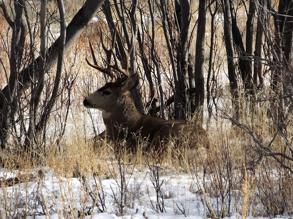 Here are some photos of mule deer and other critters I have recently taken with my new FujiFilm HS50exr digital camera. I'll add photos as I get them this winter. Most of the photos are taken at long distances with the zoom set at 42x (1000mm). All of the photos are with the camera handheld. Being a new camera for me I am learning that it behaves a little different than my old HS20exr. First, I have found that you need to make sure the focus mode switch on the left side of the camera is set to "S" for Single. Having it in Continuous "C" mode makes for getting pictures of deer that are in focus pretty darn hard. I learned the hard way with that mode... I have also found that I like the plain Auto mode over the EXR mode for getting better in-focus images. I have also stopped shooting raw photos and gone straight to just JPG. Yes, raw is better but I find it better to get a JPG than to get nothing. Shooting in raw slows down the speed with which the camera can recover before shooting another photo. I get a lot more photos of the action when shooting only JPG.