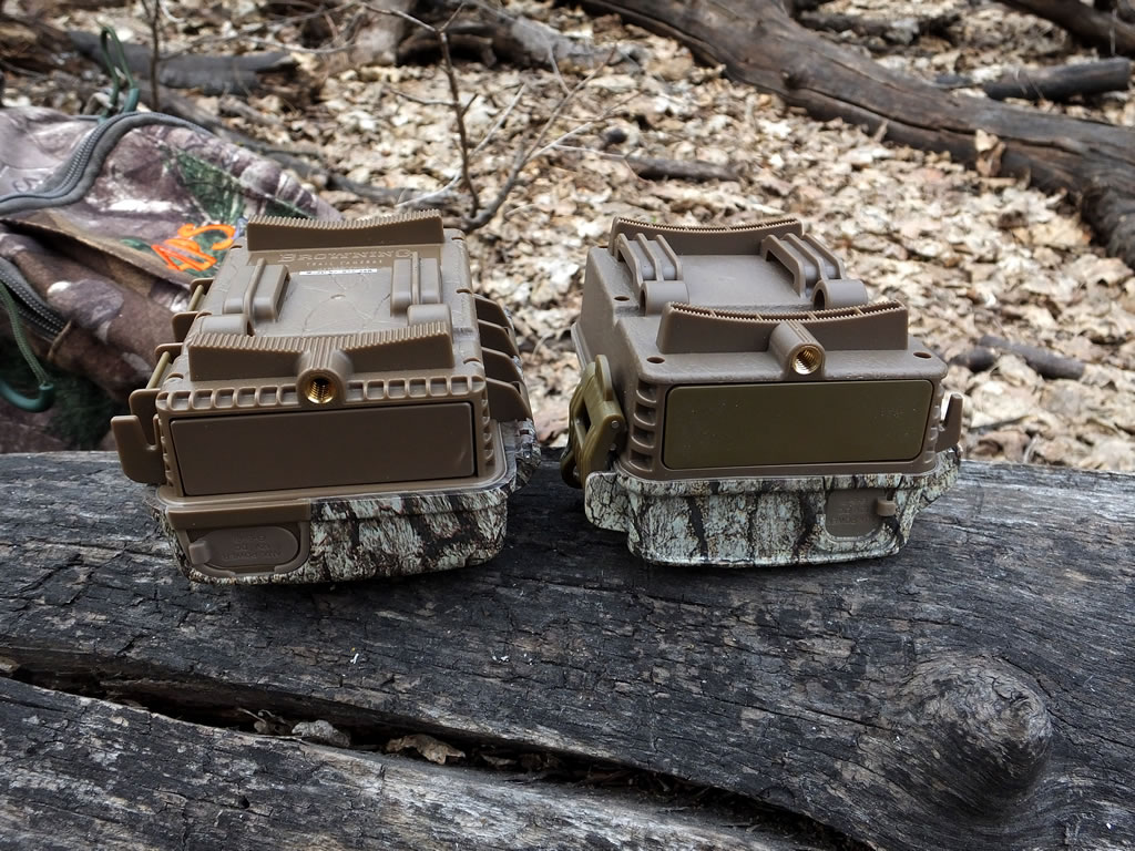 The bottom and back view of a Browning Recon Force XR next to the smaller Strike Force trail camera. I like the heavier-duty strap loops on the back of the Strike Force.