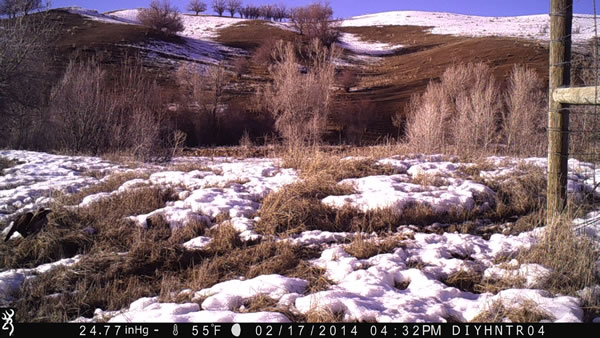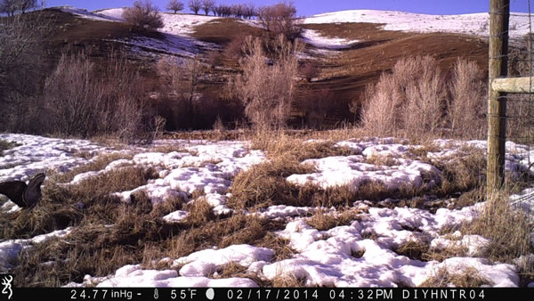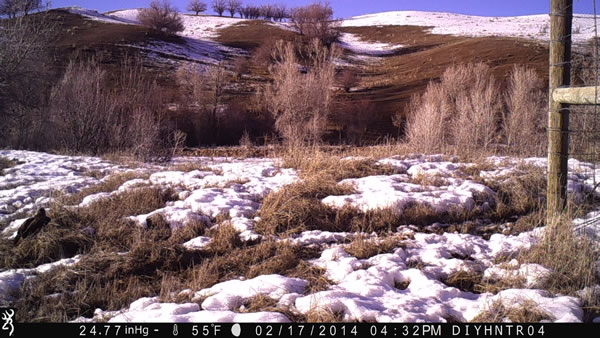 During this winter I have set out my trail cameras in a creek bottom where mule deer and turkeys like to winter. In this setup I have a Browning Spec Ops trail camera watching the edge of a fence corner post where deer like to funnel around. I have many, many deer photos and videos from this location. As I was scrolling through the many deer photos from this camera from the past couple weeks I came across these photos of a Red-Tailed Hawk pouncing on a rodent, fly up to a fence post and then a Magpie comes in to scavenge below the hawk. The trail camera was set to take six rapid-fire photos. In this setting it starts taking photos about six tenths of a second after it is triggered and then it takes six photos rapidly in two seconds time. And I have the camera set to a five second delay before it can be triggered again.