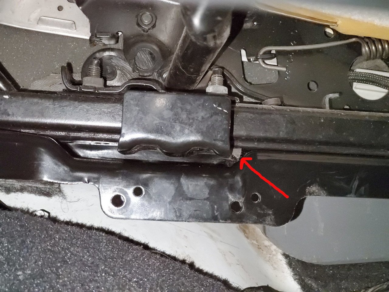Stock JK driver seat brackets mounted one inch farther back on the brackets. Notice a bar from on the seat just touches the bracket right where the arrow is at. This is as far back as you can mount the seat.