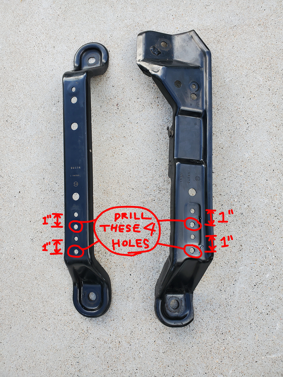 So when I removed the brackets from the 2007 JK I cleaned up the brackets, drilled, deburred and painted the new mounting holes then I replaced these stock brackets into my personal 2008 JK and it works great. I now have an additional inch of legroom in my 2008 JK all for the cost of a little Rustoleum paint and an hour of work.