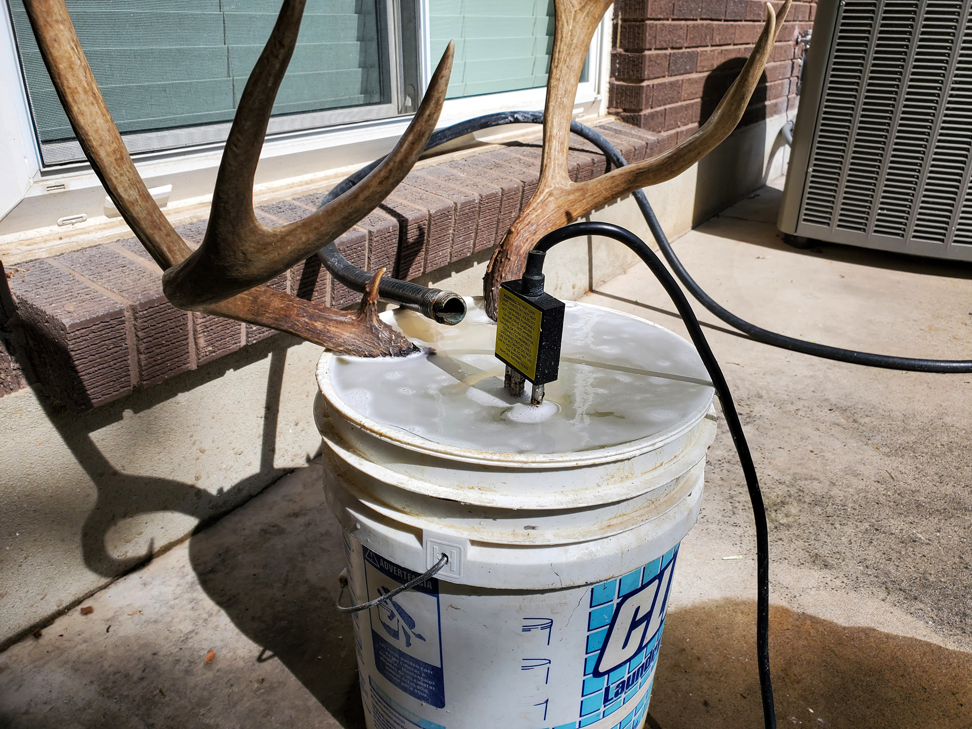 To get the skull bright white I will use 40 or 50 volume creme developer. Right after taking the skull out of the bucket of water I carefully use a paintbrush and brush it all over the skull but not on the antlers. I will then let that sit overnight. After it has sat overnight I will clean out the bucket and place the Bucket Heater and skull with the developer on it in the bucket. I will then fill the bucket up with fresh water up as high as I can until it almost touches the antlers. The top of the skull will not be submerged but most of the skull will be. I then use the Bucket Heater to heat the water for an hour. I do not trickle water into the bucket during this step because it will raise the water level over the antlers and get bleach on them. The heat of the water mixed with the bleach of the developer in the water bleaches the skull white really fast. I will also periodically brush warm water from the bucket over the top of the skull that isn't submerged working to keep that part of the skull wet as well.
