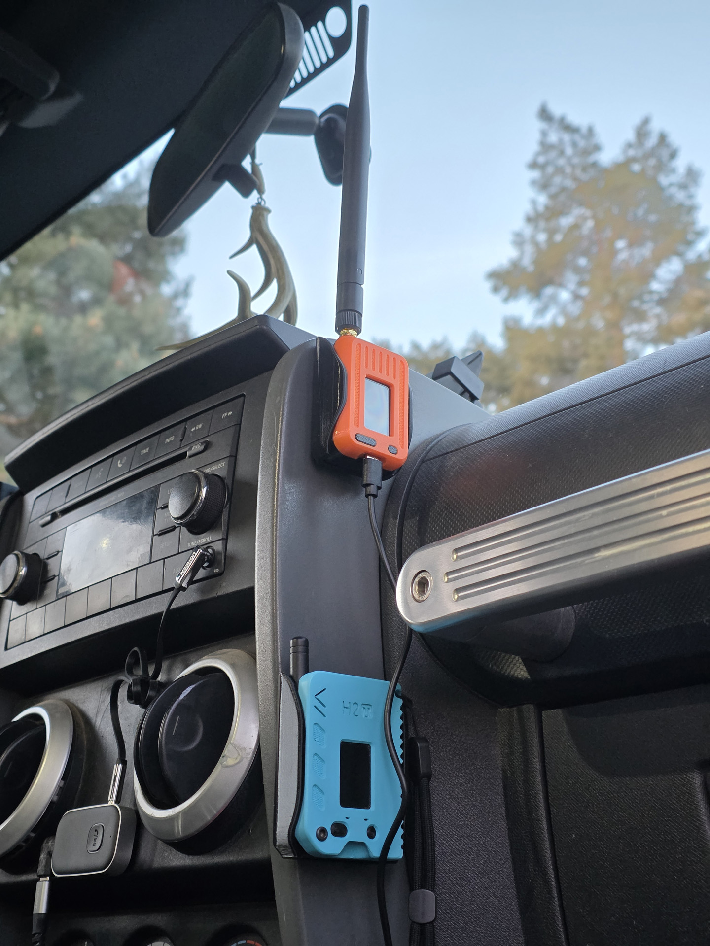 My dedicated Jeep Lora radio (top) and Kaden's blue node in my Jeep. The node for my Jeep I use without a battery and power it on with a switch for USB power from my Jeep.